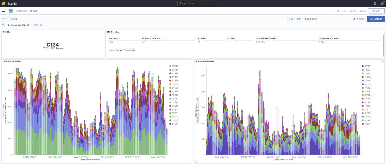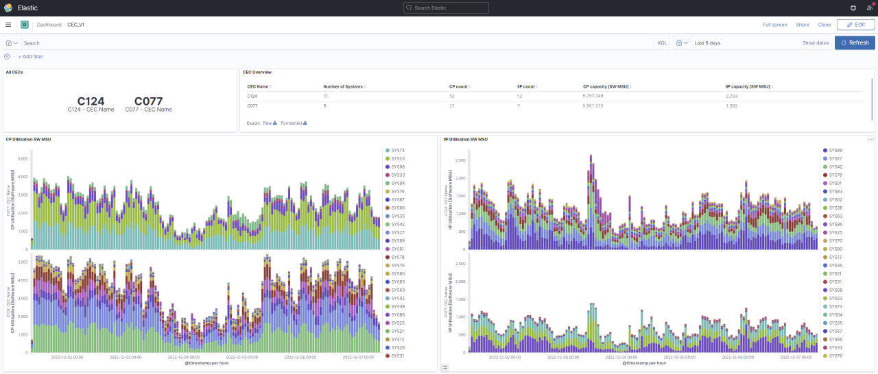 Die unteren Hälfte des Dashboards zeigt Nutzungsgerafiken der CECs auf Basis System und Prozessortypen (CP, IIP) in Software MSU.